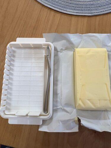 最初に買ってきたバターをこのガイドに乗せて、ナイフでカットします。